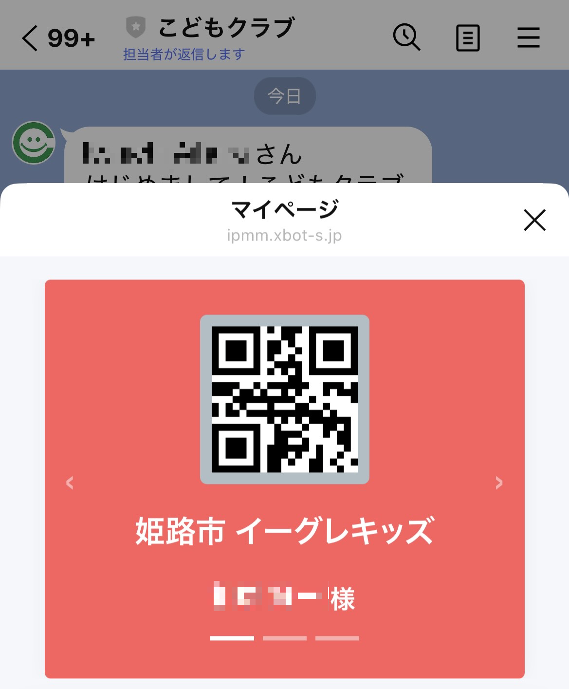 今後は、LINEのお友達の中から「こどもクラブ」を選択(検索)していただくと、入場用QRコードが表示されます。